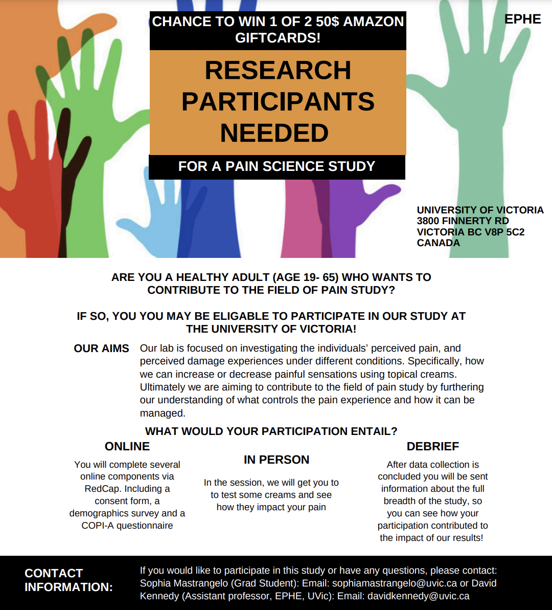 Dr. Kennedy and Graduate Student Sophia Mastrangelo are seeking individuals to participate in a pain science study investigating individuals’ perceived pain, and perceived damage experiences under different conditions. Specifically, how painful sensations can increase or decrease using topical creams. The goal of this study is to contribute to the field of pain study by furthering their understanding of what controls the pain experience and how it can be managed.